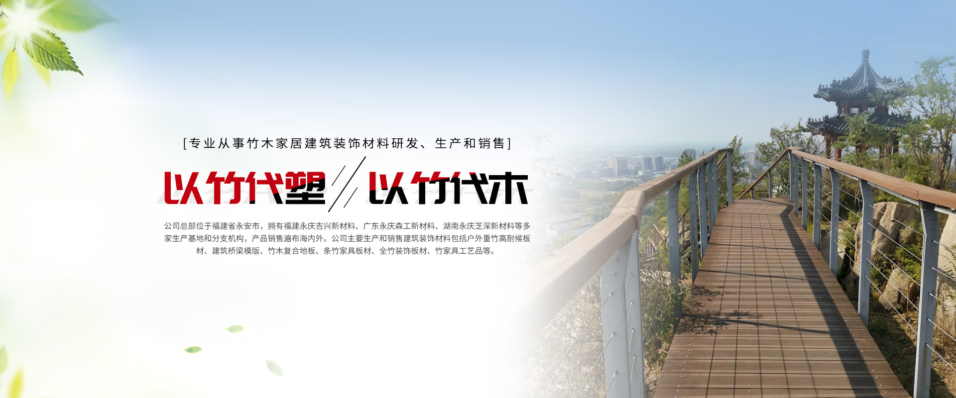 廈門永慶家居建材有限公司是福建永慶新材科技集團(tuán)公司旗下一家專業(yè)從事竹木家居建筑裝飾材料研發(fā)、生產(chǎn)和銷售的企業(yè)。公司總部位于福建省永安市,擁有福建永慶吉興新材料、廣東永慶森工新材料、湖南永慶芝深新材料等多家生產(chǎn)基地和分支機(jī)構(gòu),產(chǎn)品銷售遍布海內(nèi)外。公司主要生產(chǎn)和銷售建筑裝飾材料包括戶外重竹高耐候板材、建筑橋梁模版、竹木復(fù)合地板、條竹家具板材、全竹裝飾板材、竹家具工藝品等。公司注重產(chǎn)品品質(zhì)和創(chuàng)新,引進(jìn)世界先進(jìn)的生產(chǎn)設(shè)備和技術(shù),不斷推出高品質(zhì)、高性能、環(huán)保、節(jié)能的新型竹木建筑裝飾材料,獲得了廣泛的市場認(rèn)可和用戶信賴。